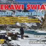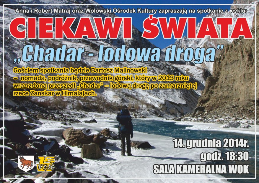 Tematem spotkania będzie Chadar czyli lodowa droga. Chadar od stuleci łączy krainy Ladakh i Zanskar położone w samym sercu Himalajów Indyjskich. Podczas ośmiomiesięcznej zimy, kiedy rzekę Zanskar częściowo skuwa lód na tyle wytrzymały aby utrzymać człowieka, rozpoczyna się Chadar, czyli lodowa droga. Szlak ten jest do dziś jedyną drogą łączącą te dwa dawne himalajskie królestwa. Mężczyźni, kobiety i dzieci codziennie pokonują kilkanaście kilometrów, nocują w jaskiniach i żywią się tsampą. Przez kilka dni wędrówki przy temperaturach spadających do – 30 st. C i na wysokości ponad 3500 m n.p.m. trwają zmagania z niebezpieczeństwami, jakie niesie przejście Chadaru. Kilkusetletnia tradycja Chadaru właśnie się kończy za sprawą budowanej drogi kołowej. Bartosz wraz z żoną Asią wracają do Zanskaru zimą, aby dwukrotnie przejść Chadar – ostatnią lodową drogę świata i zapamiętać to miejsce zanim nastąpią w nim nieodwracalne zmiany. Czy na lepsze?