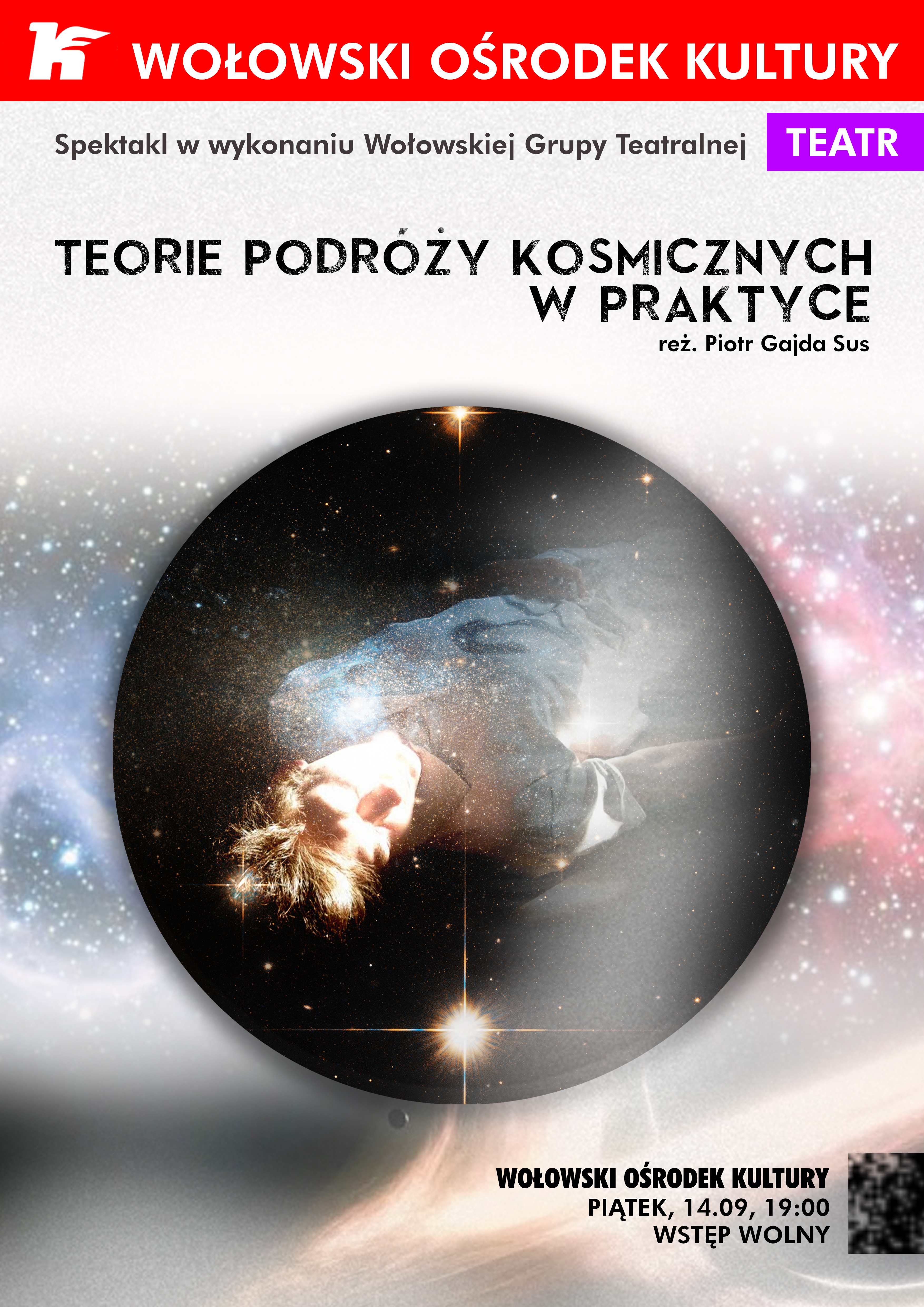 Serdecznie zapraszamy na spektakl teatralny w wykonaniu Wołowskiej Grupy Teatralnej „Teorie podróży kosmicznych w praktyce” w reżyserii Piotra Gajdy-Sus.