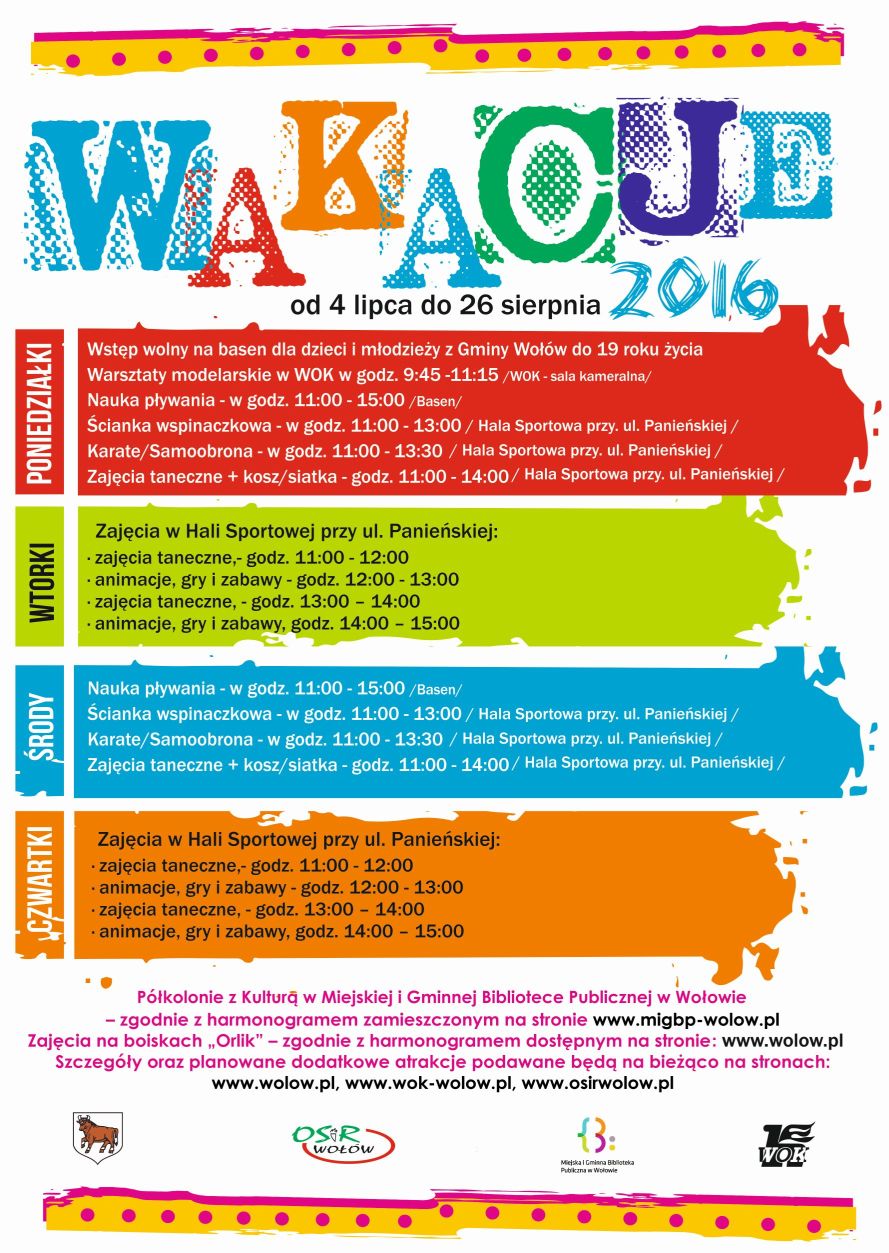 Wspólnie z Urzędem Miejskim w Wołowie, Ośrodkiem Sportu i Rekreacji oraz Miejską i Gminną  Biblioteką Publiczną zapraszamy na zajęcia  wakacyjne  od 4 lipca  do 26 sierpnia. O dodatkowych  wydarzeniach będziemy  informowali na bieżąco.