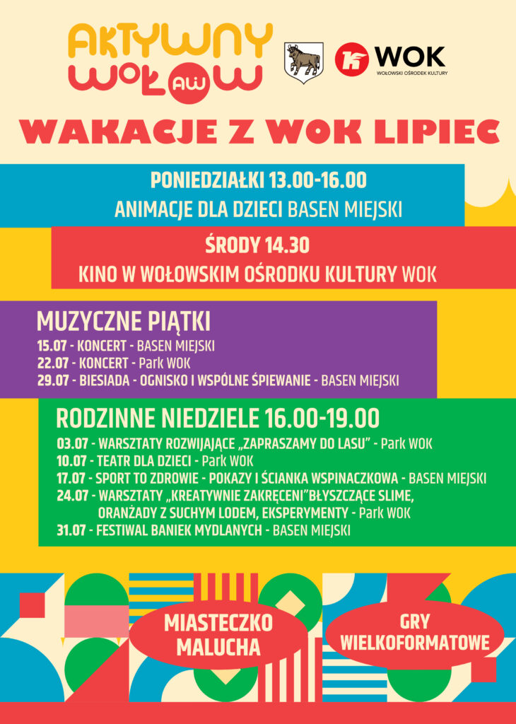 W każdy poniedziałek lipca zapraszamy na animację na terenie basenu miejskiego w Wołowie w godzinach 13.00-16.00. W środy organizowane będzie kino o godzinie 14.30 w Wołowskim Ośrodku Kultury.