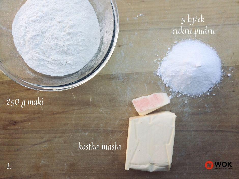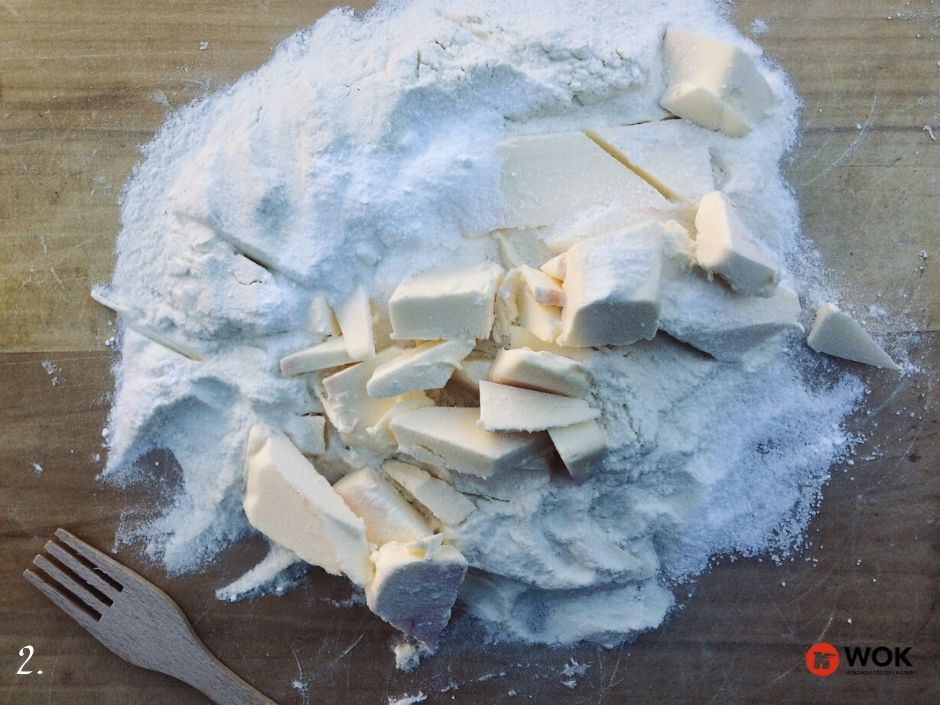 • Masło posiekaj na desce na drobne kawałki, włóż do miski. Wsyp cukier i mąkę.