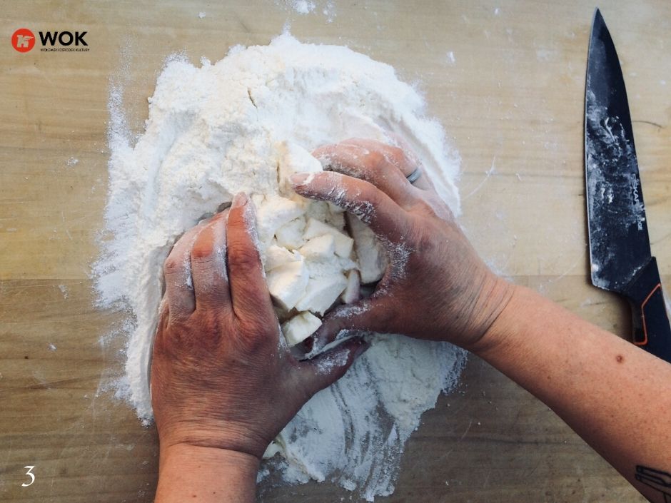 • Palcami rozgniataj kawałki masła, łącząc je z mąką i cukrem, wygniataj ręką do całkowitego połączenia. Im dłużej wygniatasz, tym szybciej łączą się składniki.