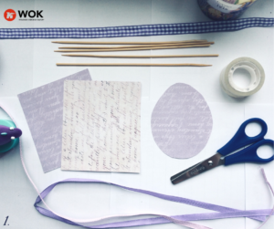 Do naszych pisanek użyłyśmy gotowego papieru z nadrukiem w kolorze fioletowym, ale ty nie musisz się ograniczać do gotowców. Skorzystaj z białych kartek, by te w późniejszym kroku pomalować, zakleić i ozdobić tak jak podpowiada ci wyobraźnia  🙂