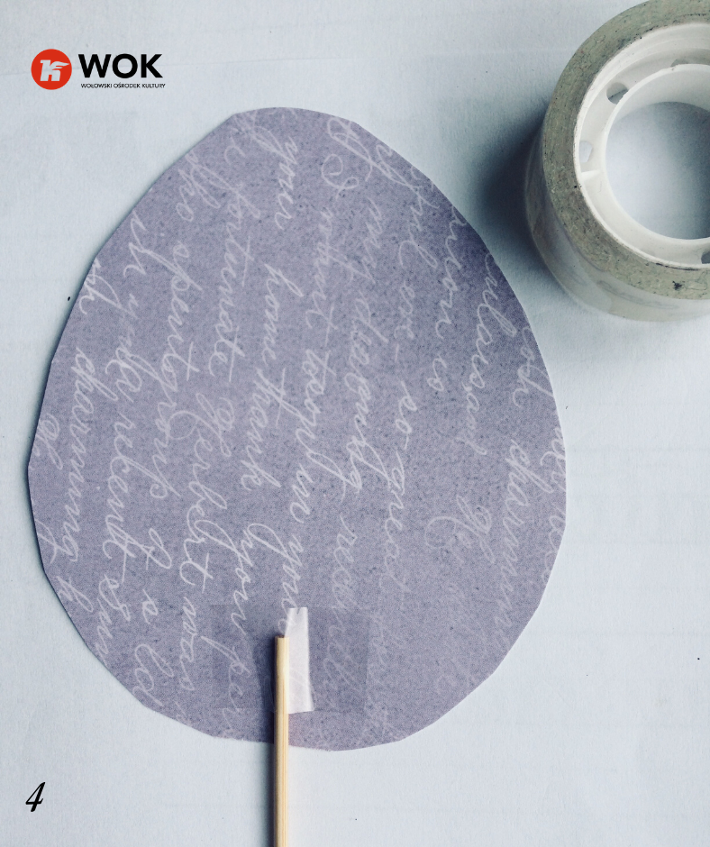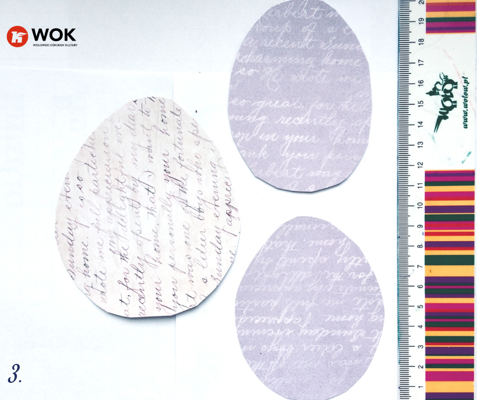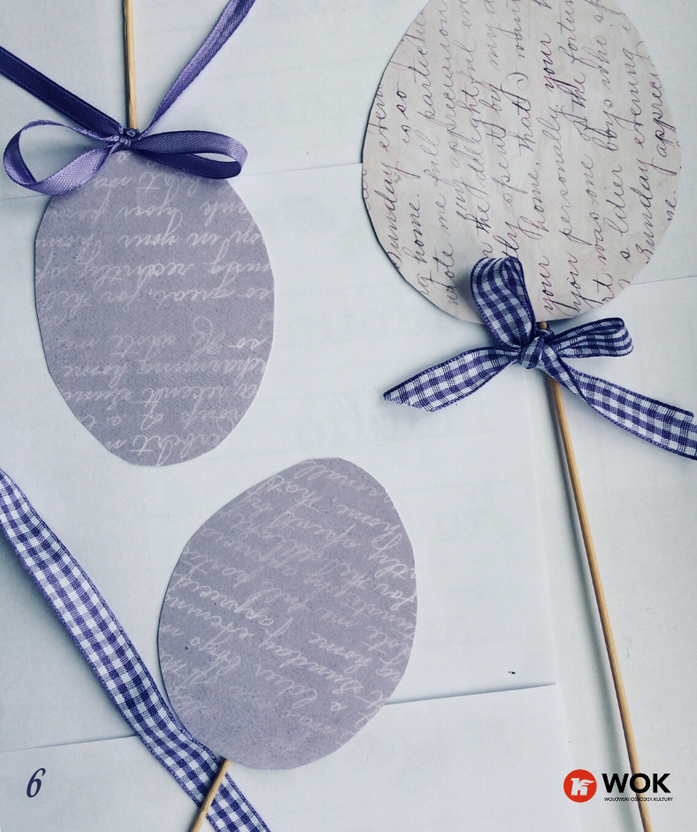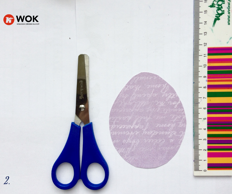 Do naszych pisanek użyłyśmy gotowego papieru z nadrukiem w kolorze fioletowym, ale ty nie musisz się ograniczać do gotowców. Skorzystaj z białych kartek, by te w późniejszym kroku pomalować, zakleić i ozdobić tak jak podpowiada ci wyobraźnia  🙂