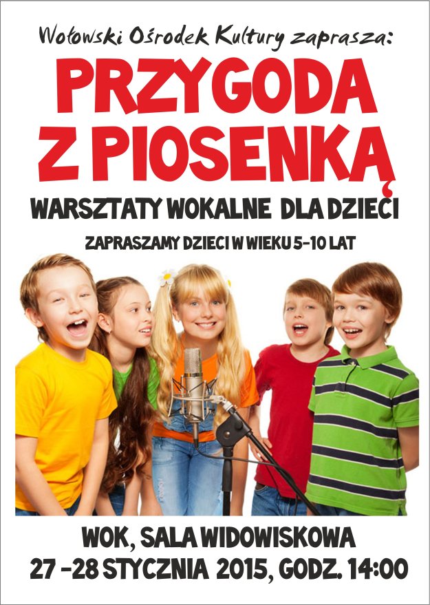 Na warsztaty wokalne „Przygoda z piosenką” zapraszamy we wtorek i środę drugiego dnia ferii  dzieci w  wieku 5-10 lat.   Będzie  to doskonała okazja  by sprawdzić swoje umiejętności wokalne i nauczyć się podstaw  warsztatowych.  Zapraszamy chętnych od  godz. 14:00.