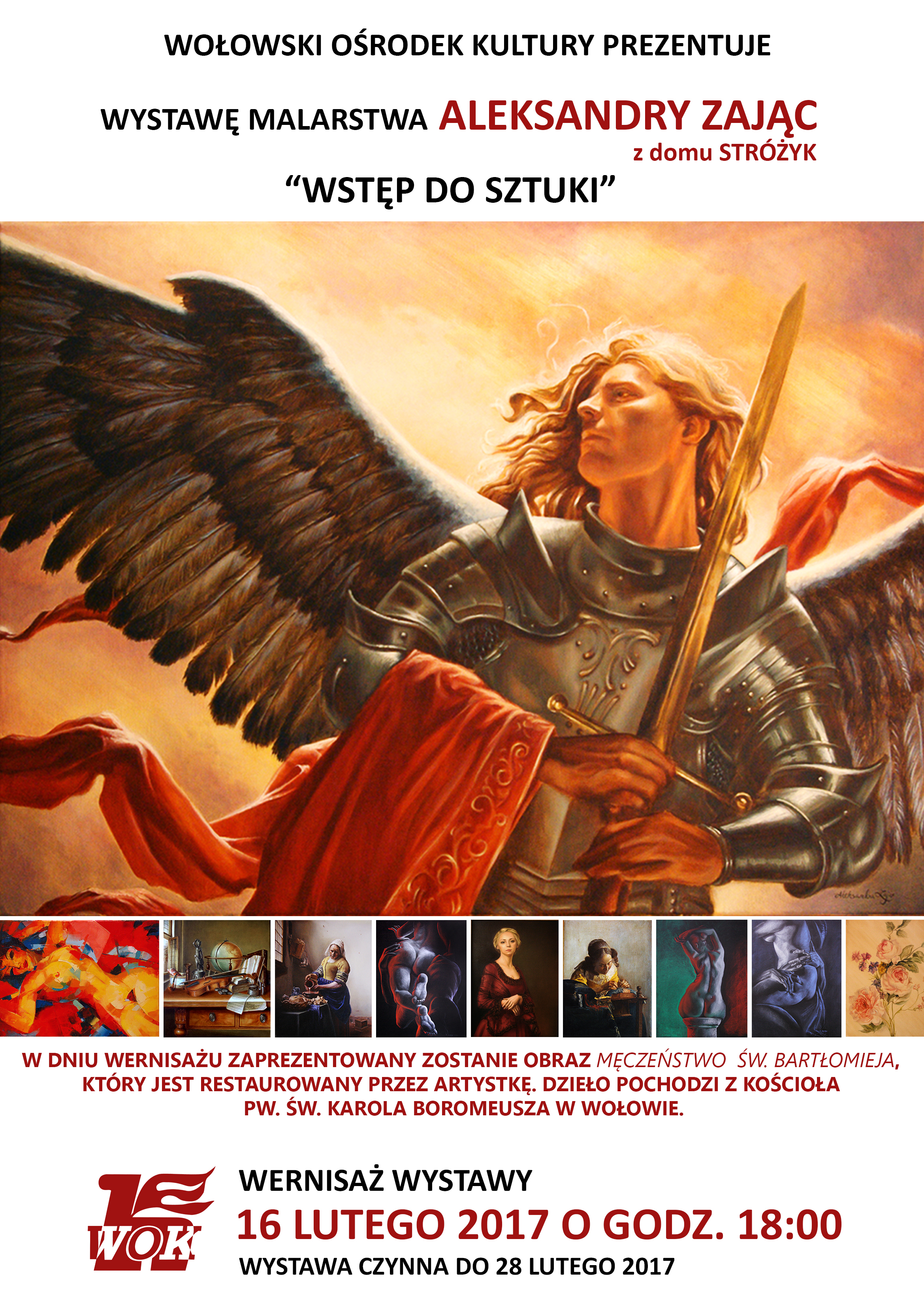 Zapraszamy do zapoznania się z relacją fotograficzną z wystawy malarstwa Aleksandry Zając pt.”Wstęp do sztuki”. Wernisaż odbył się 16 lutego w sali kameralnej Wołowskiego Ośrodka Kultury. Podczas wystawy można było zobaczyć m.in. restaurowany obecnie przez Artystkę obraz „Męczeństwo Św. Bartłomieja” – dzieło datowane na XVIII w. pochodzące z kościoła pw. św. Karola Boromeusza w Wołowie.