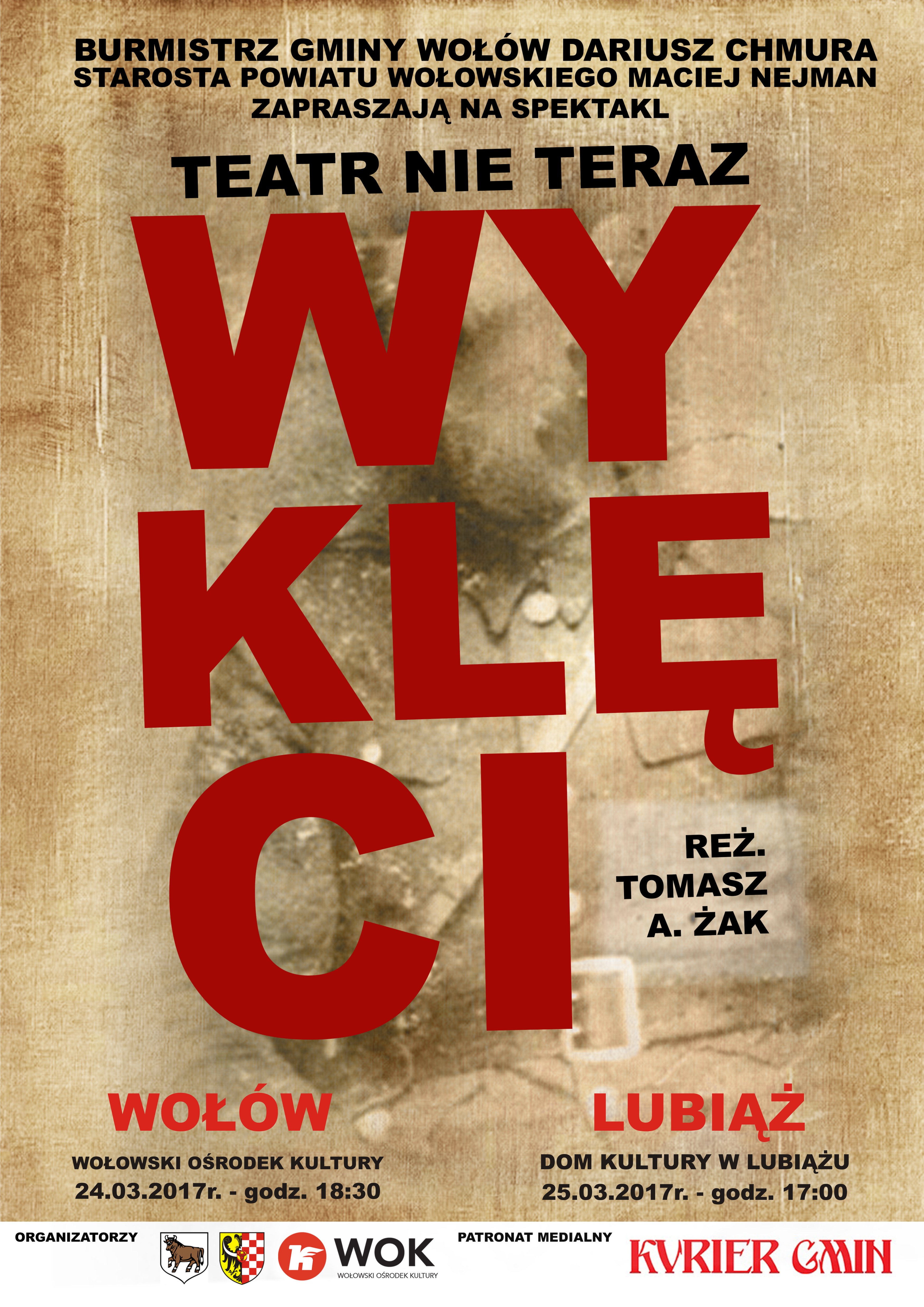 Wołowski Ośrodek Kultury, Burmistrz Gminy Wołów Dariusz Chmura oraz Starosta Powiatu Wołowskiego Maciej Nejman mają zaszczyt zaprosić Państwa na spektakl teatralny „Wyklęci” w wykonaniu Teatru „Nie teraz” z Tarnowa, który odbędzie się w Wołowie oraz Lubiążu w następujących terminach: