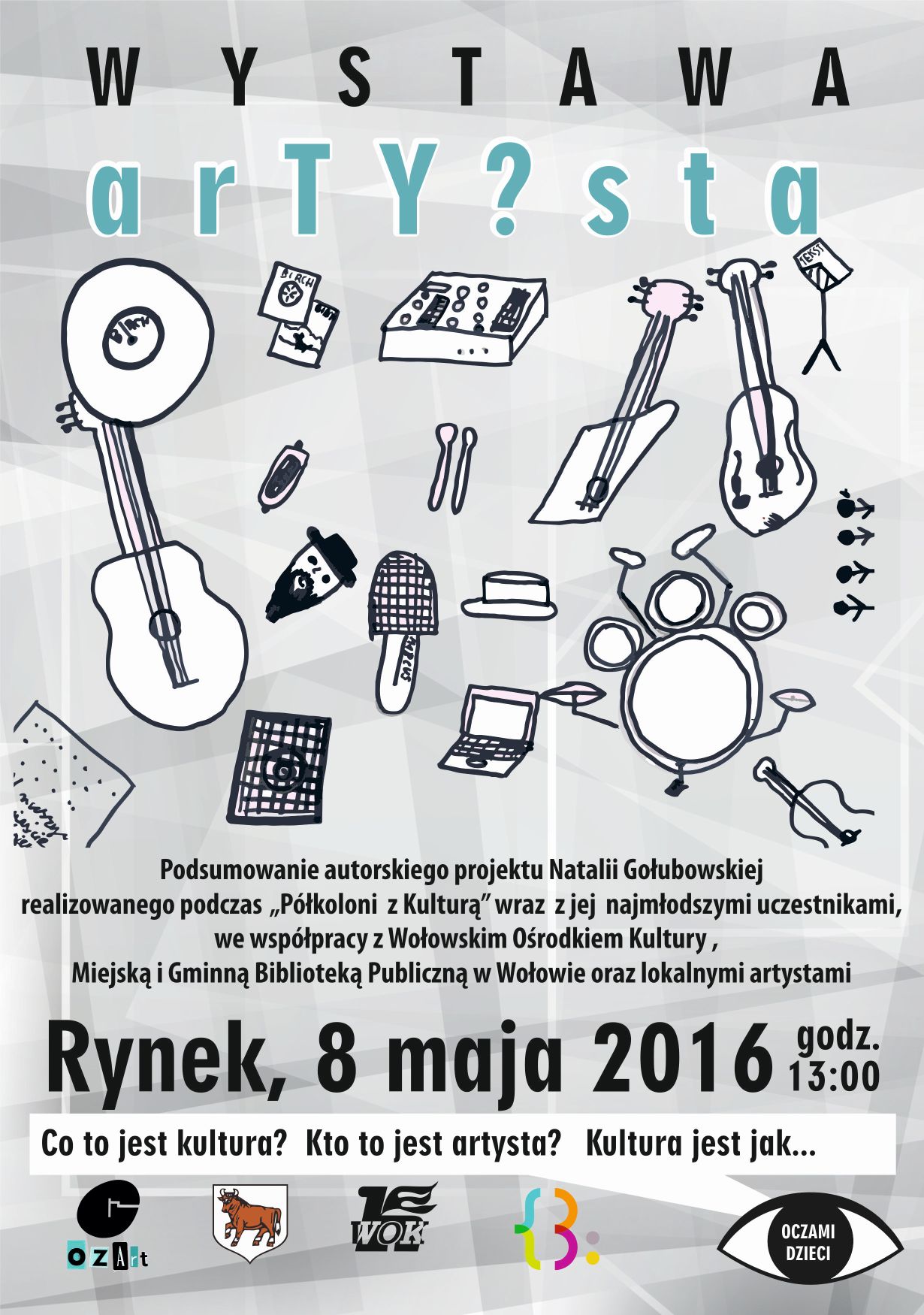 Wystawa „arTY?sta” to podsumowanie autorskiego projektu Natalii Gołubowskiej realizowanego podczas „Półkolonii z  Kulturą” wraz  z jej  najmłodszymi uczestnikami we współpracy z Wołowskim Ośrodkiem Kultury, Miejską i Gminną Biblioteką Publiczną w Wołowie oraz  lokalnymi artystami. Z zebranych materiałów powstały autorskie kolaże, prezentujące treść za pomocą dziecięcych obrazów.