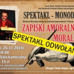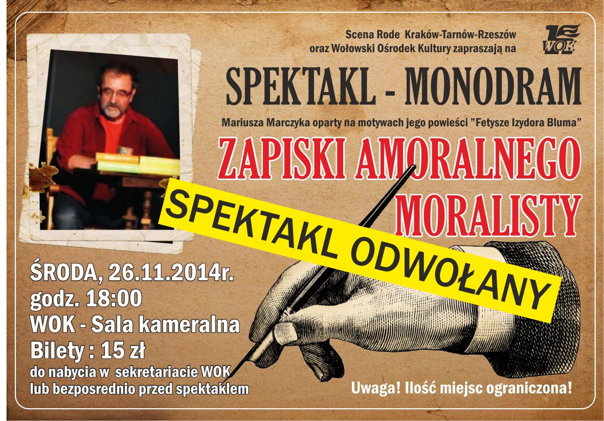 W środę, 26.11. o godz. 18:00 zapraszamy Państwa na spektakl ” Zapiski amoralnego moralisty” na motywach powieści Mariusza Marczyka „Fetysze Izydora Bluma”. Bilety do nabycia w sekretariacie WOK oraz bezpośrednio przed spektaklem w cenie 15 zł. Ilość miejsc ograniczona!