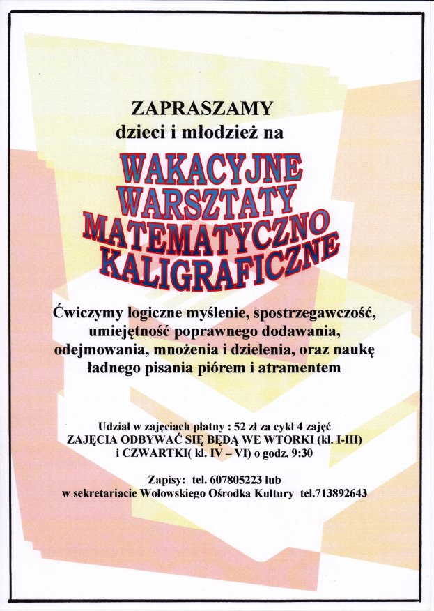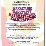 Trwają zapisy na wakacyjne warsztaty matematyczno- kaligraficzne dla dzieci i młodzieży. Uczestnicy podczas zajęć będą zajmować się historią cyfr, liczb, a także poznawać dokładniej jaka jest różnica między liczbami wymiernymi, całkowitymi, niewymiernymi. Poza tym w programie: ćwiczenie logicznego myślenia, spostrzegawczości, a także sprawności szybkiego dodawania, odejmowania, mnożenia czy dzielenia. Dodatkową atrakcją będzie nauka ładnego pisania piórem i atramentem oraz konkurs szybkiego liczenia. Dla najlepszych uczestników zajęć- atrakcyjne nagrody!